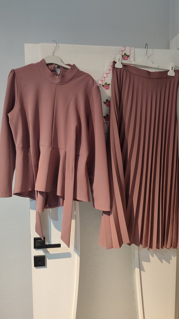 Bej renkli, uzun kollu, yüksek yakalı kadın takımı, yumuşak estetik kumaştan yapılmıştır. Piliseli etek ve rahat kesimiyle günlük kullanıma uygundur.
