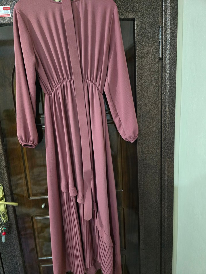 Koyu pembe renkli, piliseli detaylara sahip uzun kollu ve bol kesim uzun elbisedir. Sentetik kumaştan üretilmiş, sade ve mütevazı bir görünüme sahiptir.