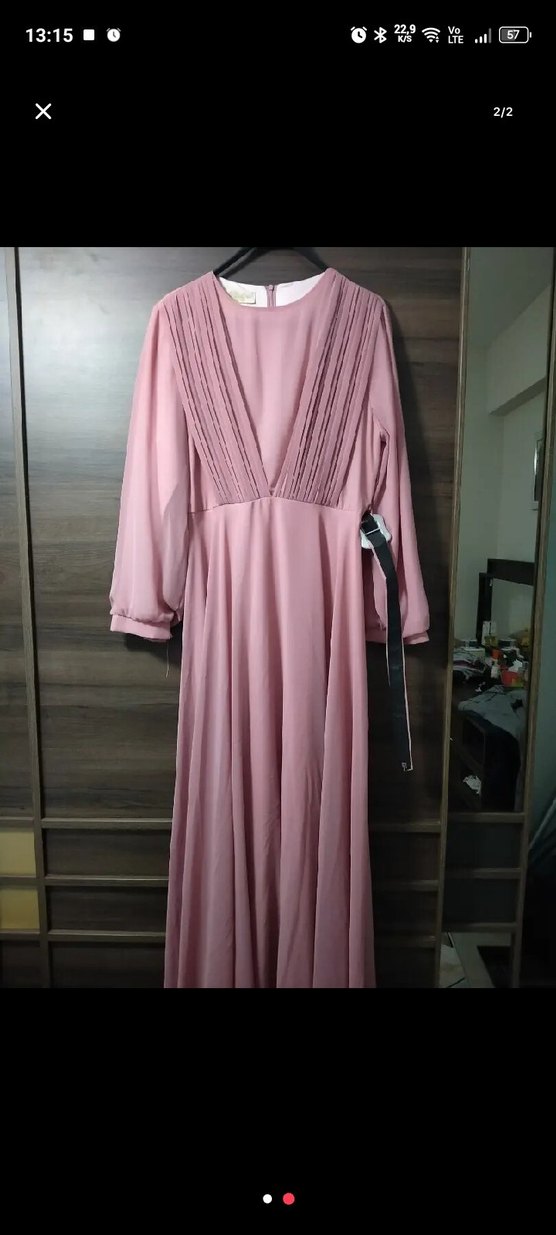 Pudra pembesi renginde, piliseli detaylı, V yakalı ve uzun kollu uzun abiye. Sentetik kumaştan, minimalist ve modern klasik tarzda, düğün için uygun.