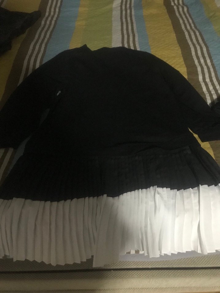 Siyah uzun kollu, yuvarlak yakalı tunik. Alt kısmında piliseli detaylar bulunur. Sentetik kumaştan, rahat kesim ve günlük kullanıma uygundur.