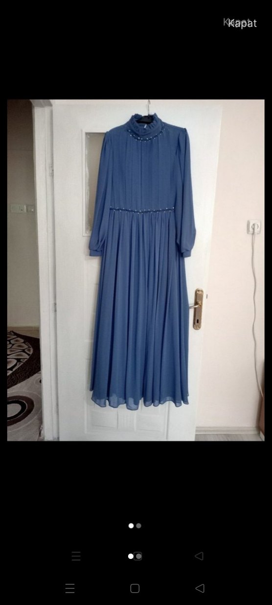 Piliseli detaylara sahip, uzun boylu mavi kadın abiye elbise. Yüksek yakalı, uzun kollu ve bol kesimdir. Düğünler için uygun, modern klasik ve vintage tarzda.