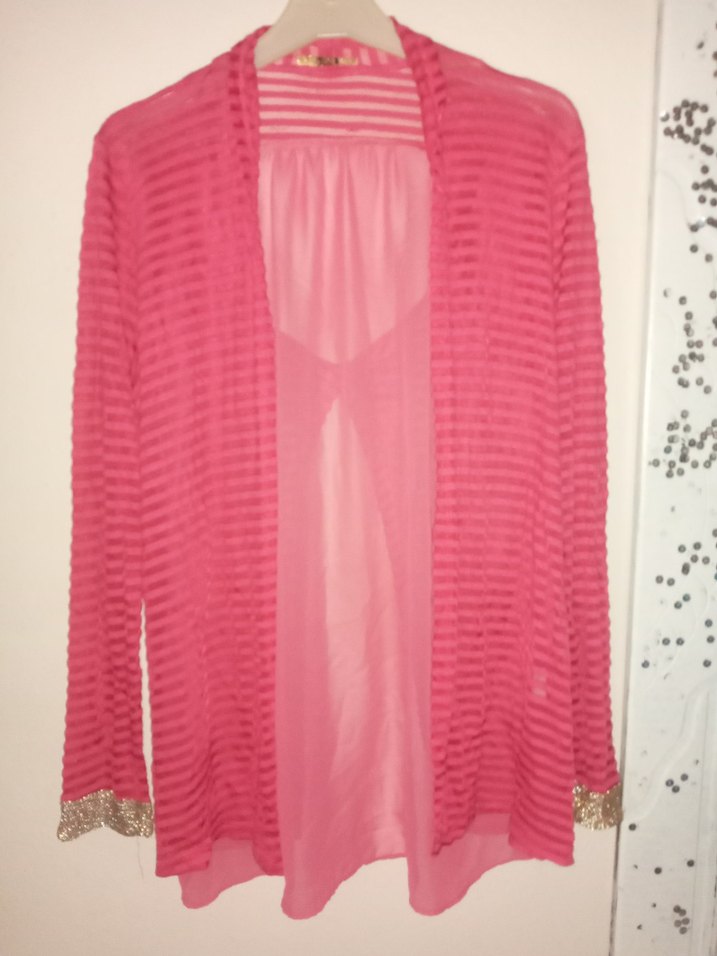 Piliseli detaylı, uzun ve bol kesim pembe hırka. Uzun kollu, tek renk ve parlak sentetik kumaştan, bohem tarzda.