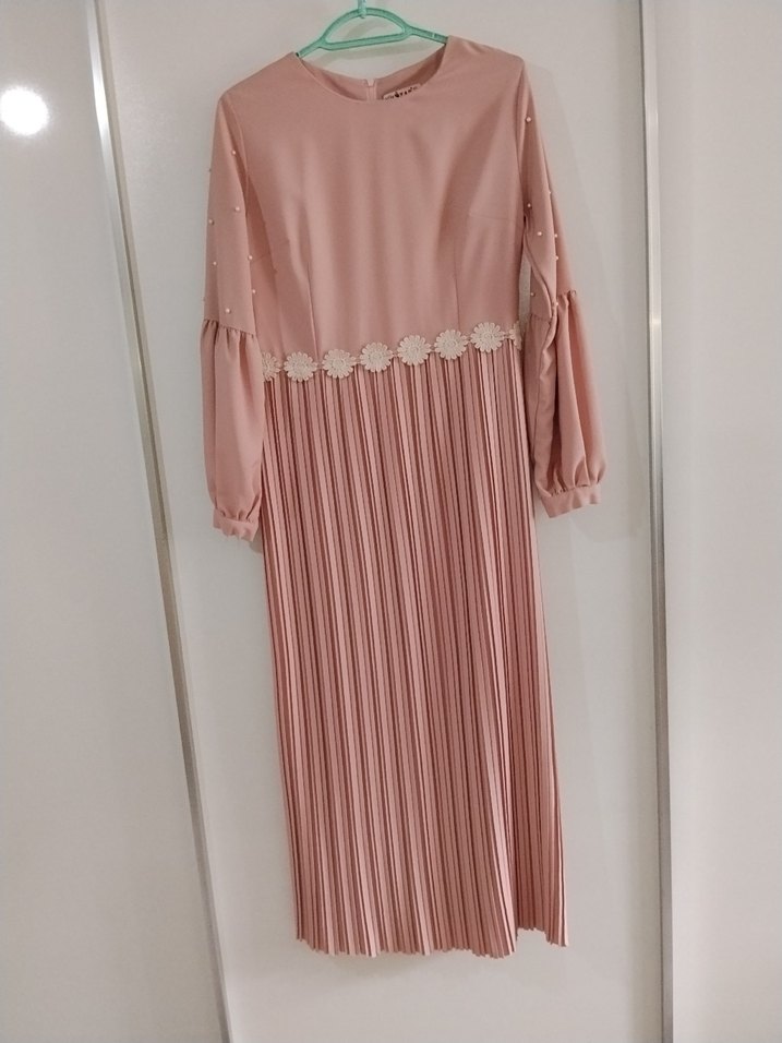 Pudra renginde, piliseli etekli ve yuvarlak yakalı uzun elbise. İnci detaylı uzun kollu ve çiçekli bel süslemeli, yumuşak krep kumaştan yapılmıştır.