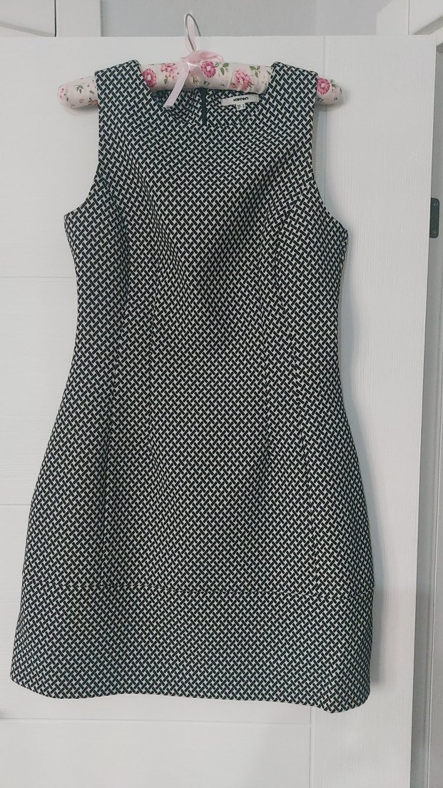 Siyah gri desenli, piliseli detaylı, V yakalı, kolsuz ve midi boy kalem elbise. Günlük sokak modasında kullanılabilir.