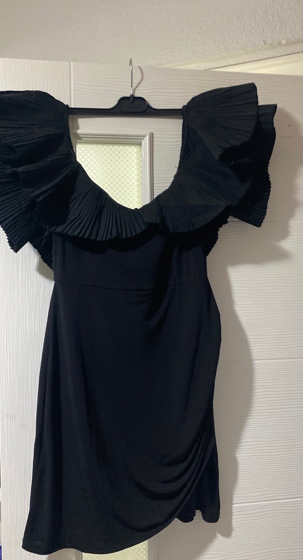 Bu siyah abiye elbise, piliseli yakası ve vücuda oturan kesimi ile dikkat çekiyor. Kolsuz ve V yakalı, gotik tarzda, parti için uygun uzun ve desensiz bir modeldir.