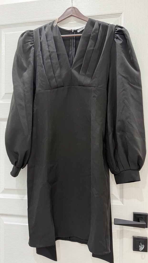 Piliseli V yakası ve uzun balon kollu, siyah uzun gece elbisesi. Düzenli kesim ve gotik tarzda, ofis kullanımı için uygundur.