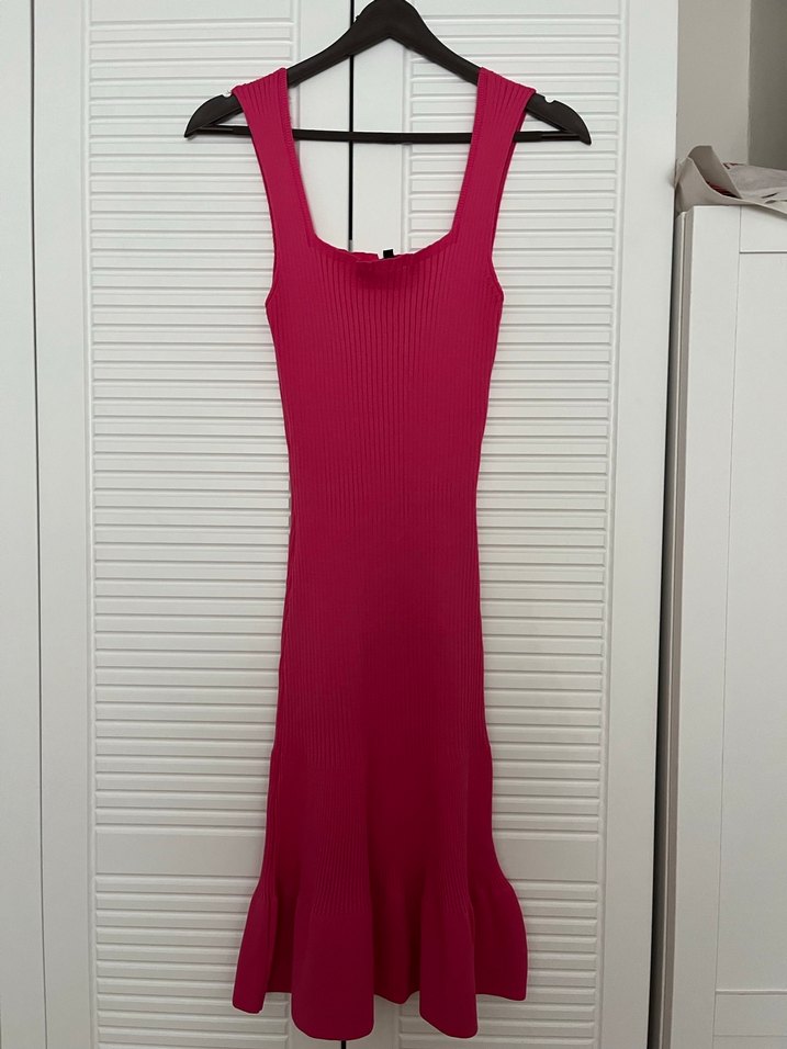 Kolsuz, v yakalı ve piliseli detaylı uzun triko elbise. Yumuşak sentetik kumaştan üretilmiş, koyu pembe renkte, modern ve minimalist tarzda bir parça.