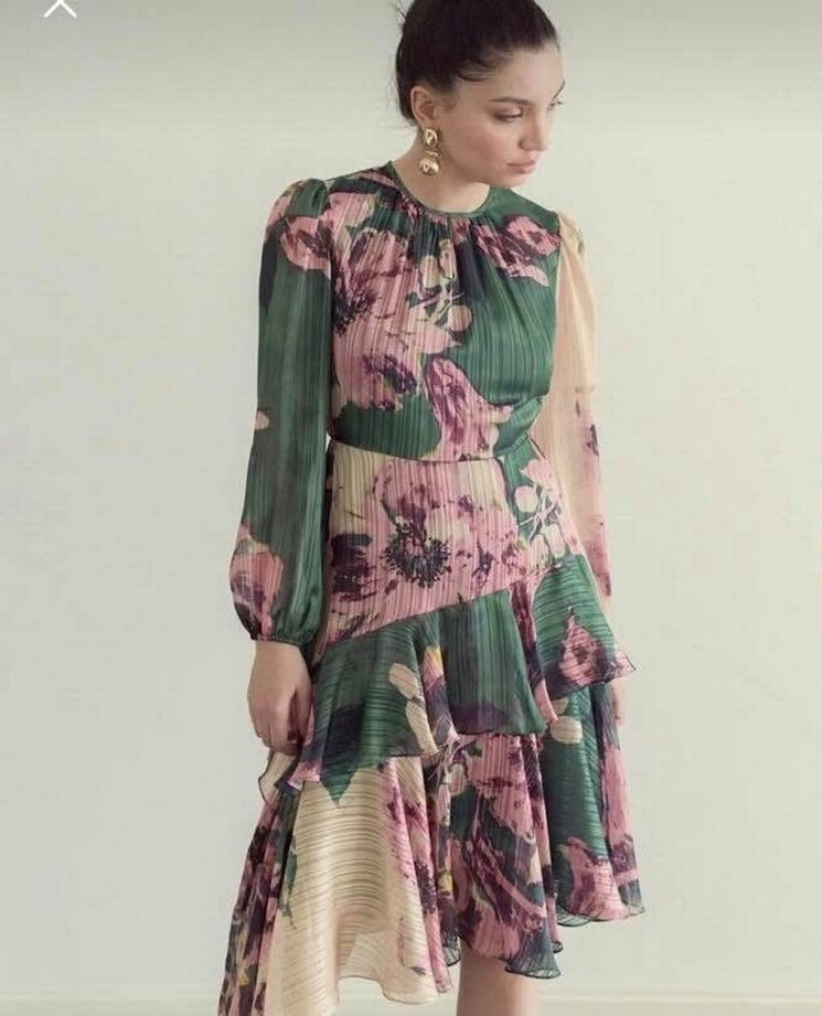 Piliseli, yüksek yakalı, uzun kollu ve bol kesim bu elbise, pastel haki tie-dye desenli ve yumuşak sentetik kumaştan üretilmiştir. Bohem vintage tarzda, romantik akşamlar için uygundur.