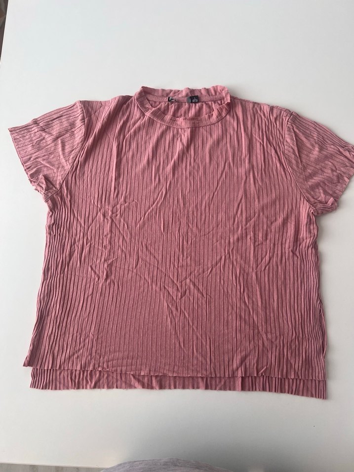 Kadınlar için kısa kollu, yüksek yakalı ve pilili dokuda pembe keten tişört. Rahat kesimi ve pastel rengiyle günlük sokak stiline uygundur.