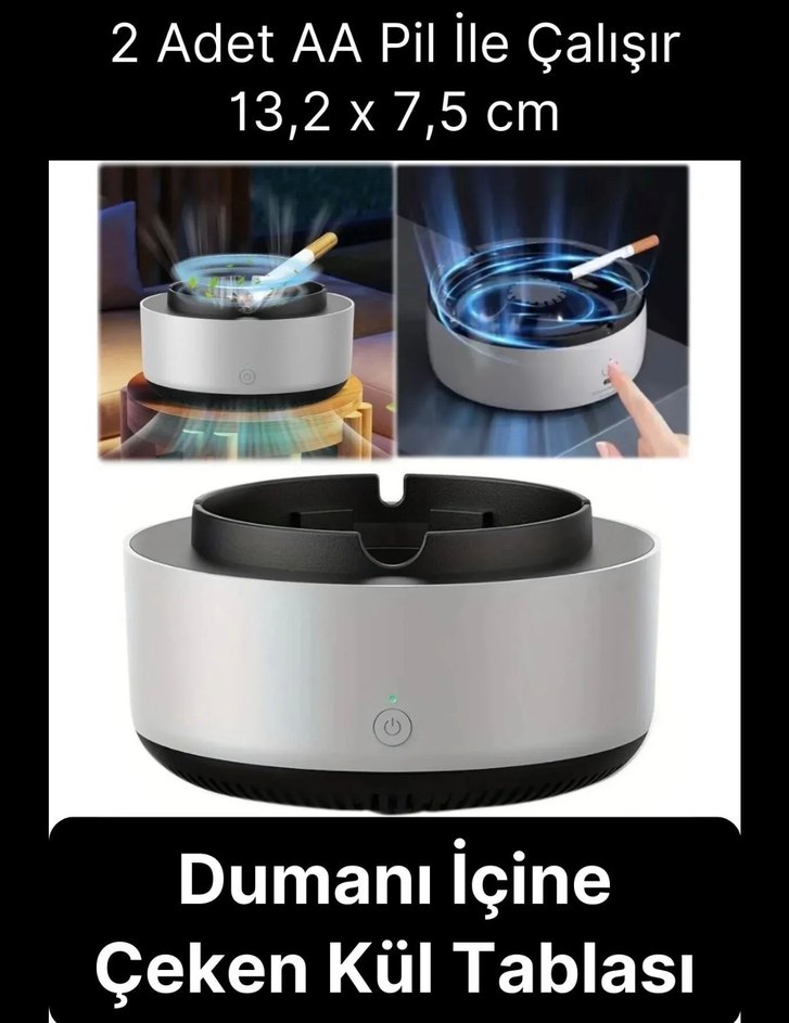 13,2 x 7,5 cm boyutlarında, 2 adet AA pil ile çalışan, dumanı içine çeken gri kül tablası.