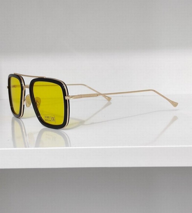 Parlak sarı şeffaf camlı, klasik ve karşı kültür tarzı kare çerçeveli, ince metal saplı güneş gözlüğü.