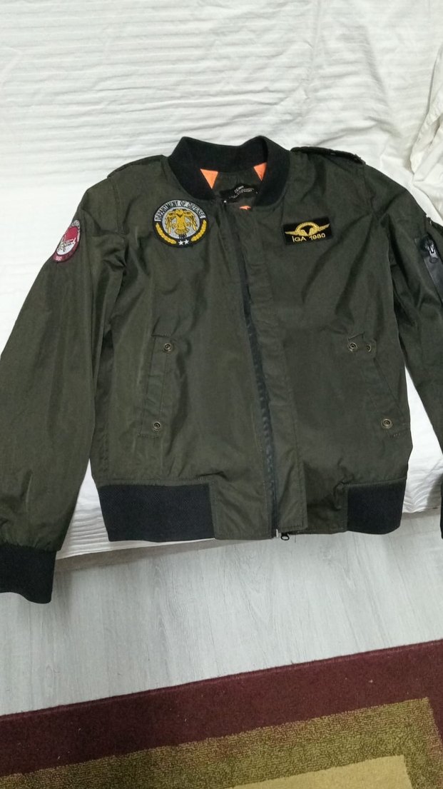 Kahverengi kamuflaj desenli, sentetik kumaştan yapılmış, uzun kollu ve fermuarlı bomber ceket. Normal boyda, oturan kesim ve yaka detayı bulunur.