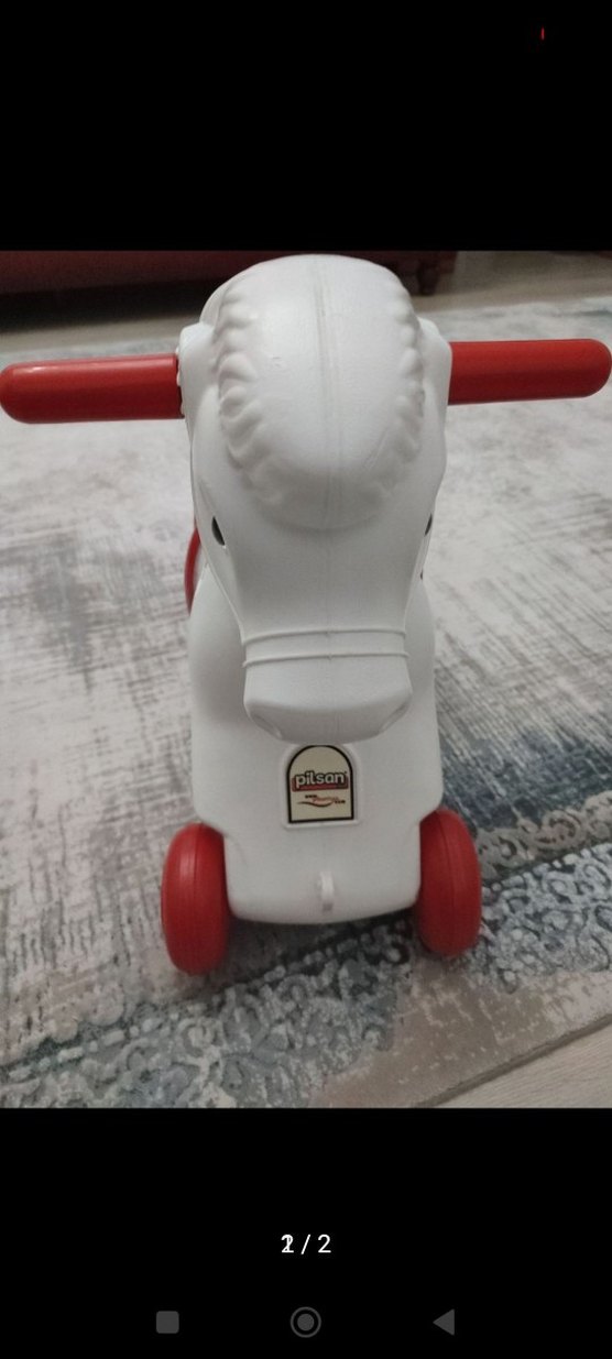Pilsan markalı beyaz renkli çocuk scooter'ı, kırmızı renkli tutma yerleri ve tekerlekleri ile renkli bir tasarıma sahiptir.