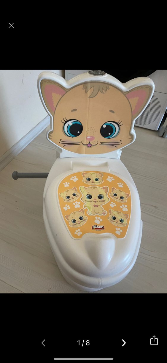 Pilsan markalı, kedi figürlü bebek lazımlığıdır. Rahat oturma yeri ve kullanımı kolay tutamağı vardır.