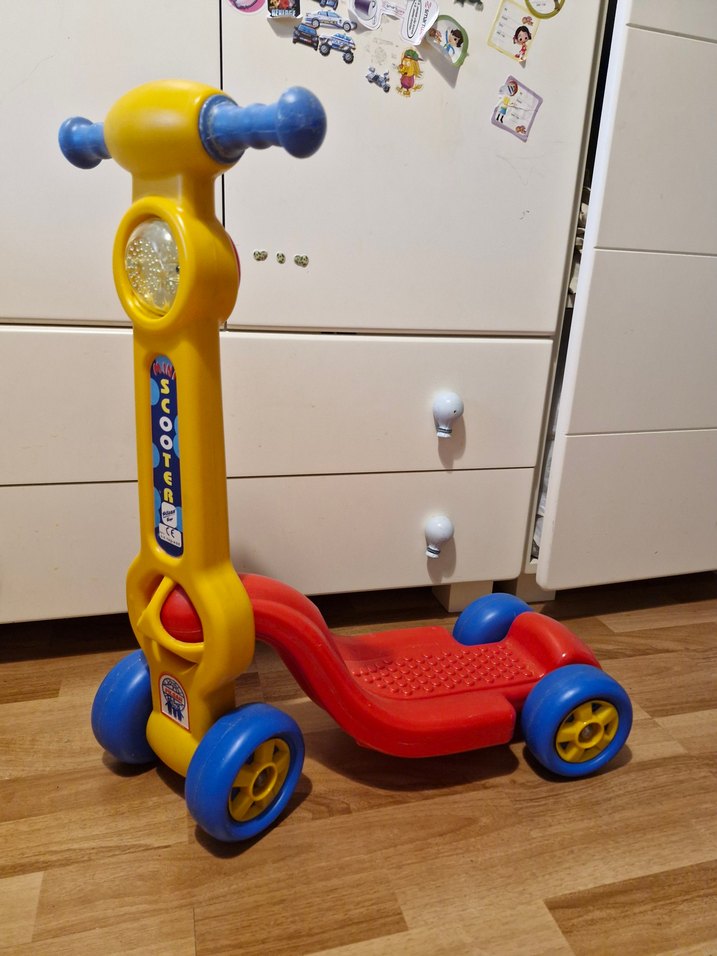 Pilsan Renkli çocuk scooter'ı sarı gövde, mavi tutacaklar ve tekerlekler ile kırmızı ayaklık içerir, çocuklar için uygundur.