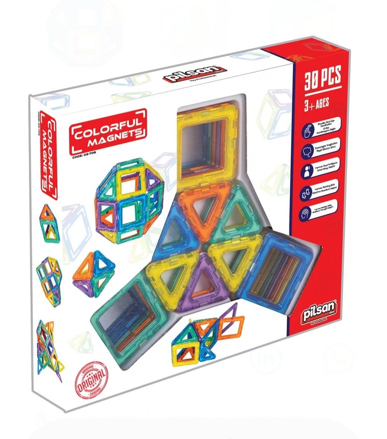 Pilsan markalı 3 yaş ve üzeri çocuklar için 30 parçadan oluşan renkli manyetik eğitim oyuncak setidir. Farklı geometrik şekillerle yaratıcılığı destekler. az kullanılmış sorusunsuz kutusuz gönderim sağlanacaktır. 18 kare 12 üçgen