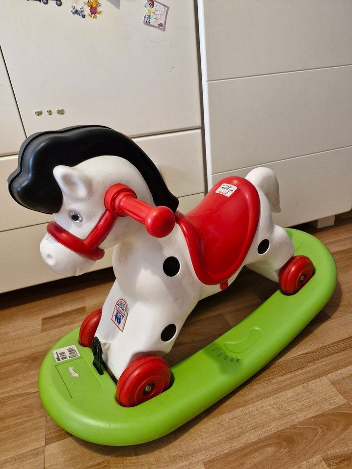 pilsan cok iyi durumda Beyaz gövdesi, siyah yelesi, kırmızı eyer ve yeşil tabanı olan renkli sallanan at oyuncağı. Çocukların tutması için kulplar ve tekerlekler içerir.