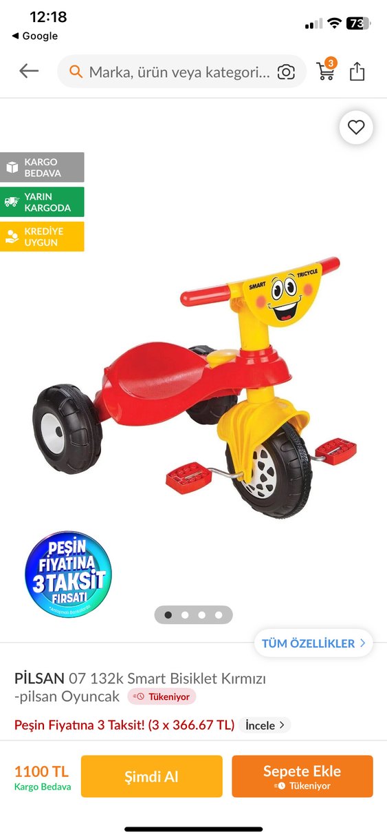 Pilsan Smart üç tekerlekli bisiklet, sarı ve renkli tasarımıyla dikkat çeker. Dayanıklı tekerlekler ve pedal içerir. temiz ürün