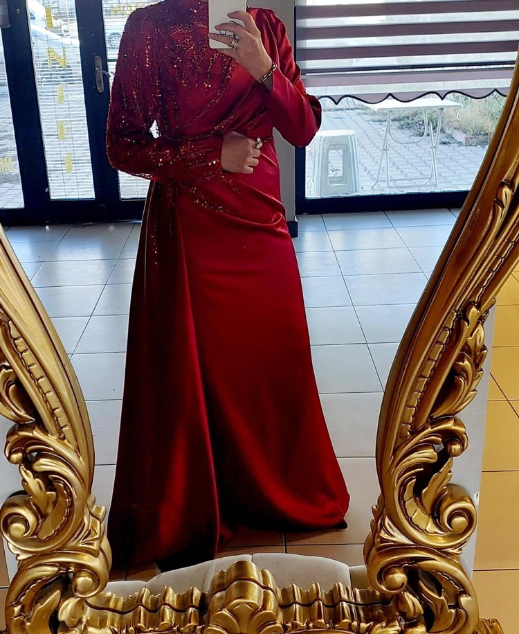 Bordo, uzun kollu, yüksek yakalı ve işlemeli parlak kumaştan yapılmış uzun abiye. Drapeli tasarımı ve regular kesimiyle düğünler için uygun.