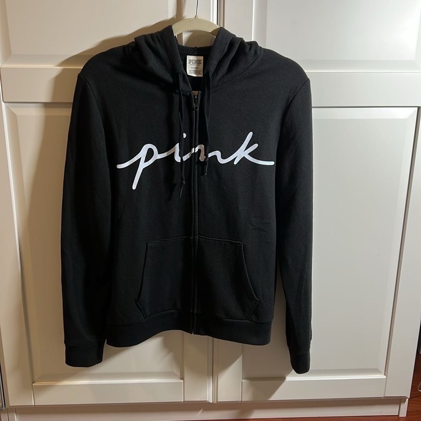 Siyah, fermuarlı, kapüşonlu ve uzun kollu sweatshirt. Önünde 'pink' baskısı ve yüksek yakası vardır. Yumuşak fleece kumaştan, dar kesim.