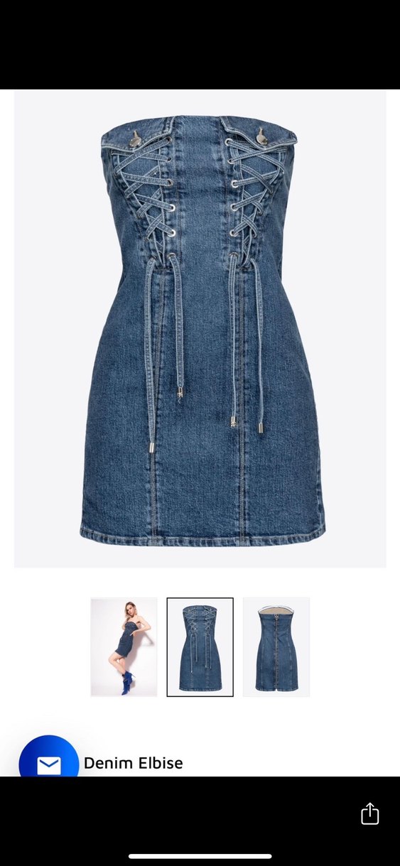 Askılı, kemerli ve bağcıklı detaylı koyu mavi denim midi elbise. Günlük sokak stiline uygun, vücuda oturan kesim.Askıları çakabilir