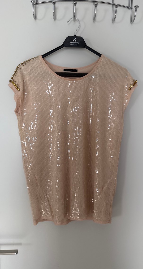 Payetlerle süslenmiş, bej renkli kolsuz bluz. Salaş kesim, yuvarlak yaka ve normal midi boyda, parti için uygun. ✨