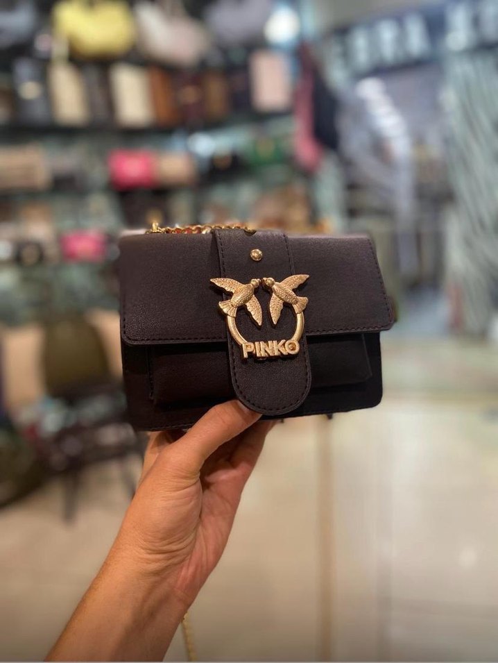 PINKO logosu ve tokası olan siyah deri kadın çantası. Günlük kullanıma uygun, sokak modasına uygun desenli tasarım.