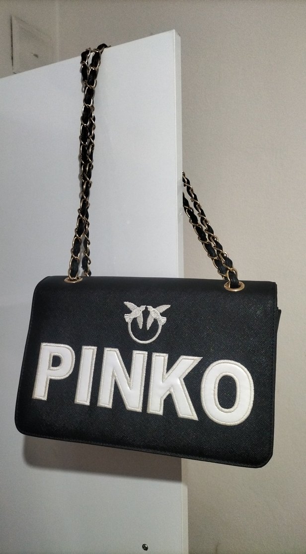 Zincir detaylı, siyah deri çanta, PINKO baskılı ve rock punk tarzını Paris havasıyla yansıtan model.
