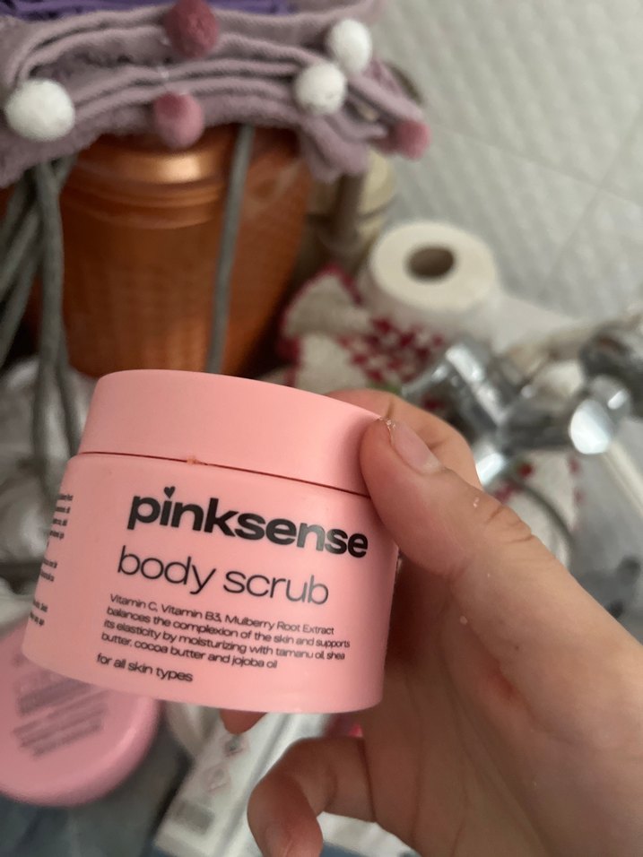 Pinksense vücut peelingi, C vitamini, DS vitamini ve Dut Kökü özü içerir. Shea yağı, kakao yağı ve jojoba yağı ile cildi peeling yapar ve nemlendirir. Tüm cilt tipleri için uygundur.