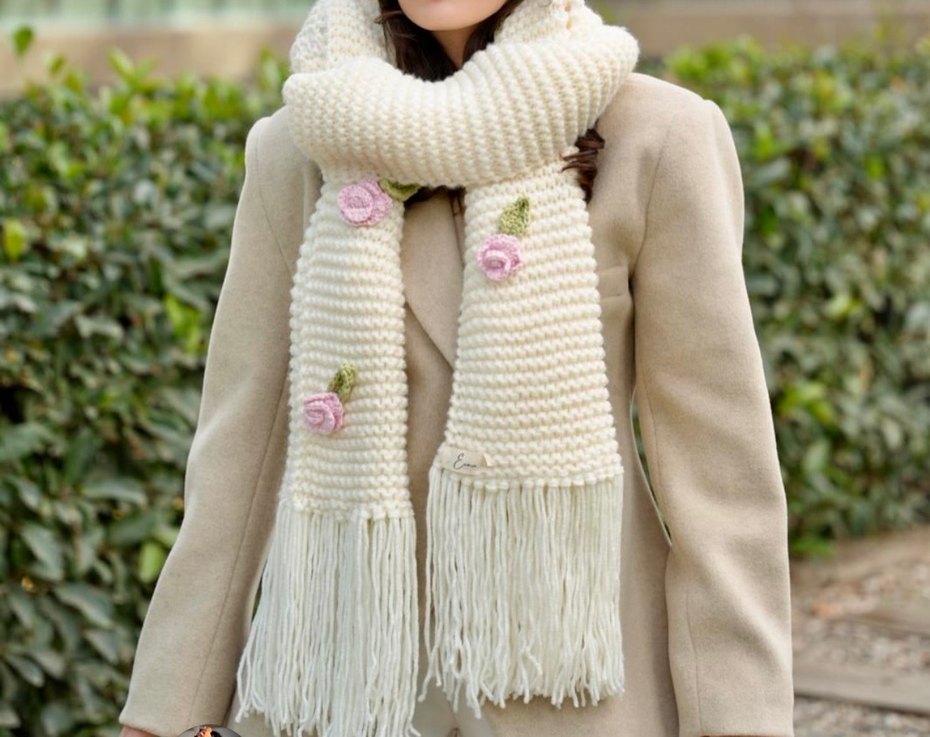 Beyaz örgü dokusu ve pastel pembe çiçek işlemeleriyle uzun püsküllere sahip, bohem tarzı yansıtan kadın şalı.