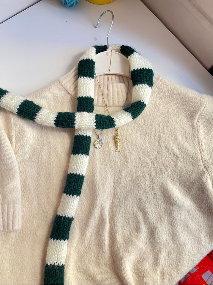 Yeşil ve beyaz çizgili atkı yumuşak ve sıcak dokuma kumaşa sahip.