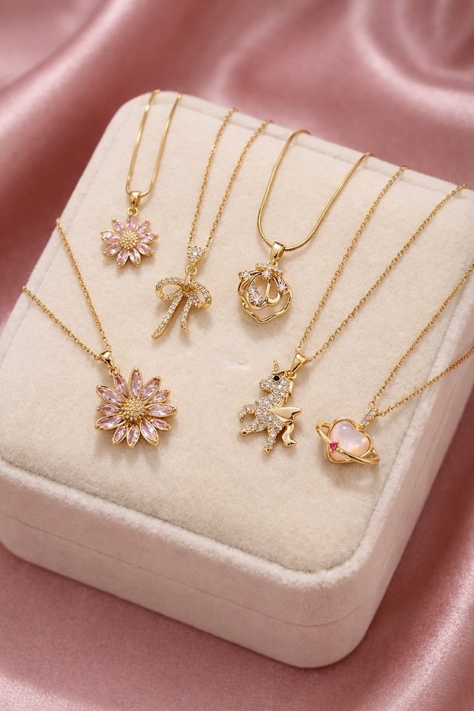 Altın renkli midi uzunlukta, pastel çiçek desenli ve payetli detaylara sahip kadın kolyesi. Bohem ve gösterişli tarzı günlük kullanıma uygun şekilde birleştirir.