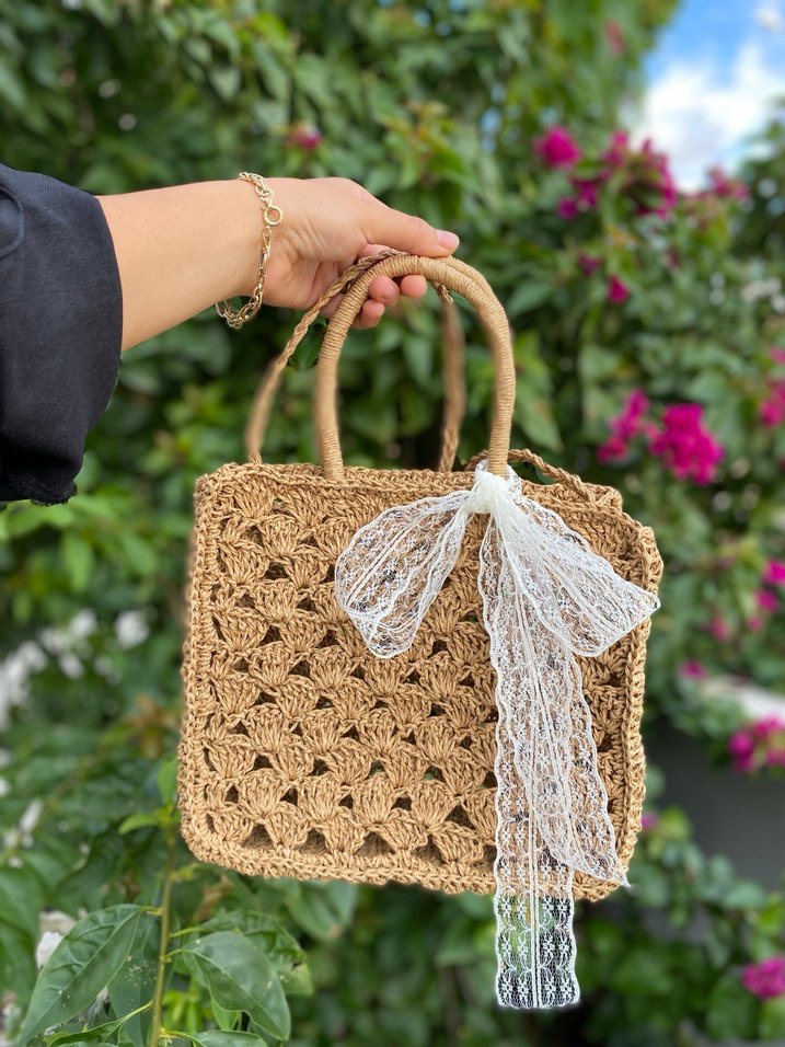 Bej renkli, işlemeli desenli, örgü kumaştan yapılmış dantelli bohem tarzda kadın çantasıdır. Günlük kullanıma uygundur.