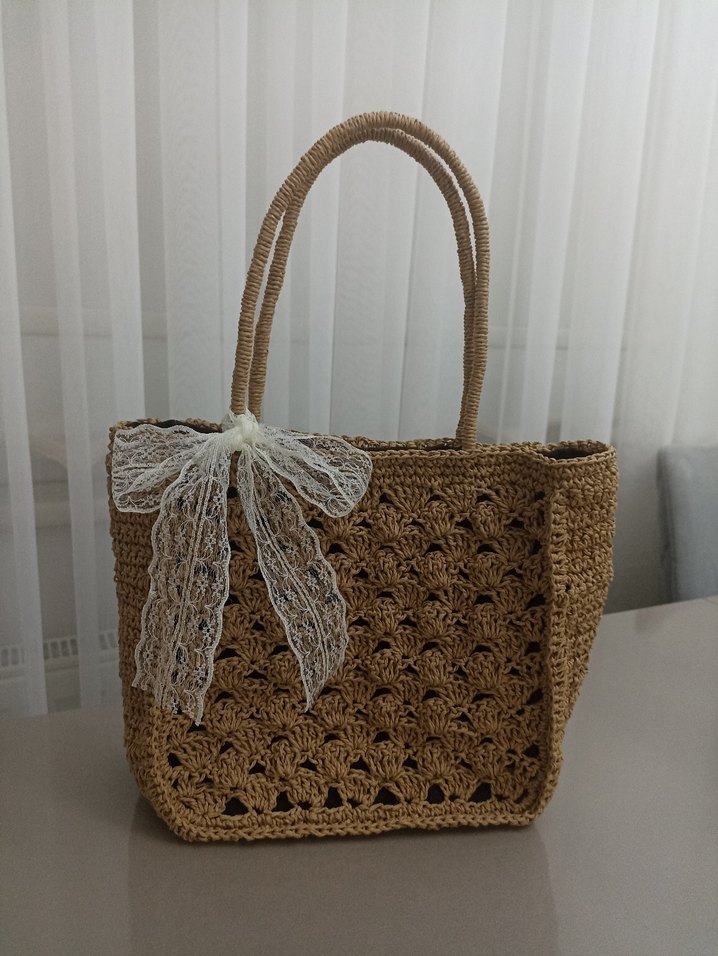 Dantel fiyonk detaylı örgü kadın çantası, bohem tarzda ve hafif renkte. Günlük kullanıma uygun. El emeği
