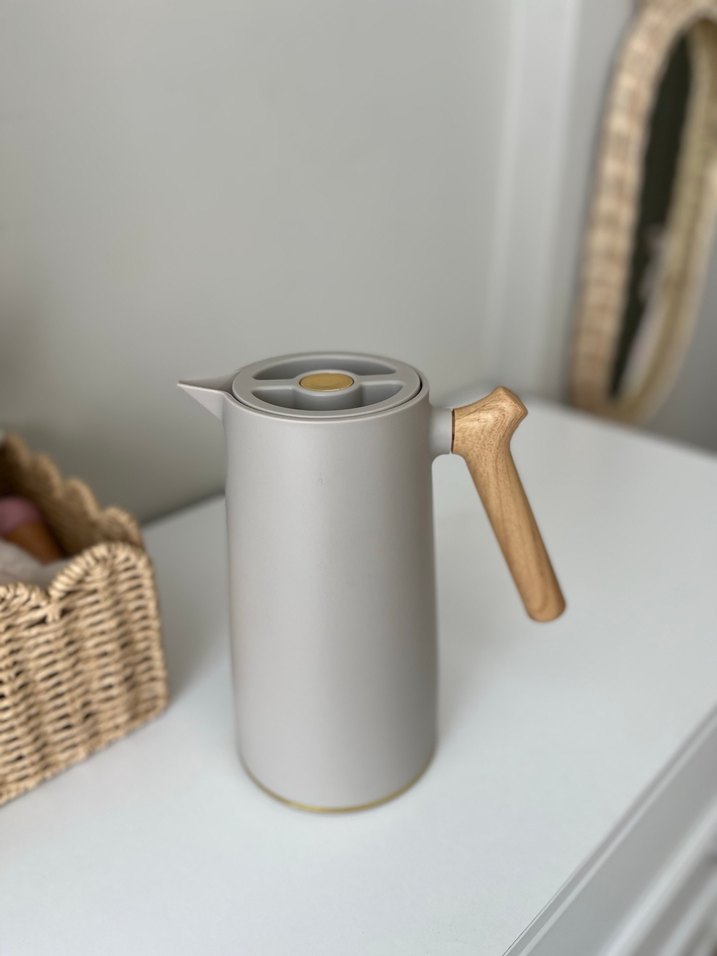 Bej renkli, mat yüzeyli ve kolay tutuş sağlayan ahşap kulplu demlik. Modern tasarımıyla mutfağınıza şıklık katıyor. ☕