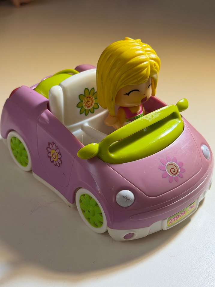 Yeşil detaylı, çiçek desenli pastel pembe oyuncak araba içinde piknik sepeti ve sarı saçlı figür bulunur.