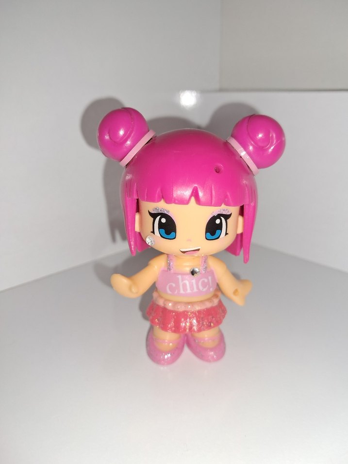 Pastel pembe renkte, parlak gözlü ve üstünde "chic" yazılı simli kıyafetli bebek figürü. İki topuzlu saç stili ve neşeli ifadeye sahip.
