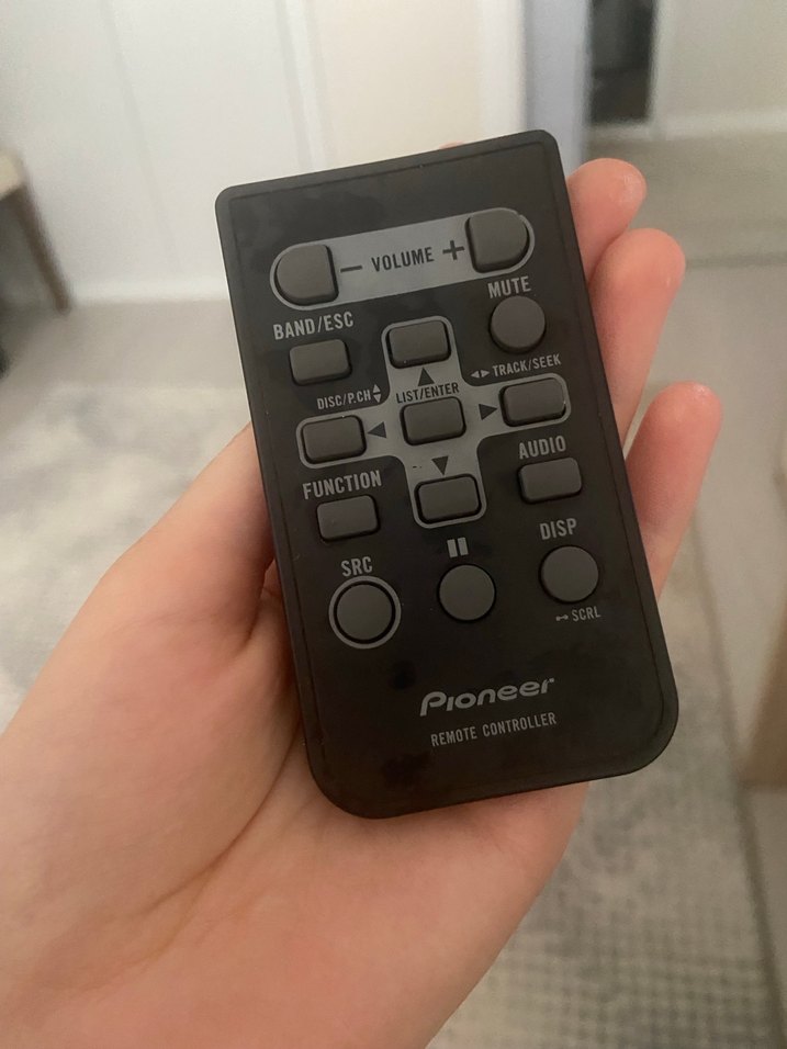 Siyah Pioneer kumanda, sessize alma, bant/esc, fonksiyon, ses kontrolü ve ses ayarları için düğmelere sahiptir. Müzik sistemleriyle uyumludur.