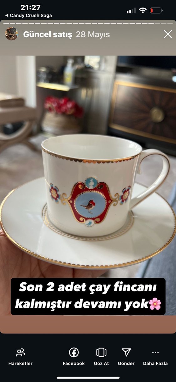 Beyaz çay fincanı ve tabağı, çiçek ve kuş desenli, altın detaylıdır. Son 2 adet kalmıştır, devamı yoktur.