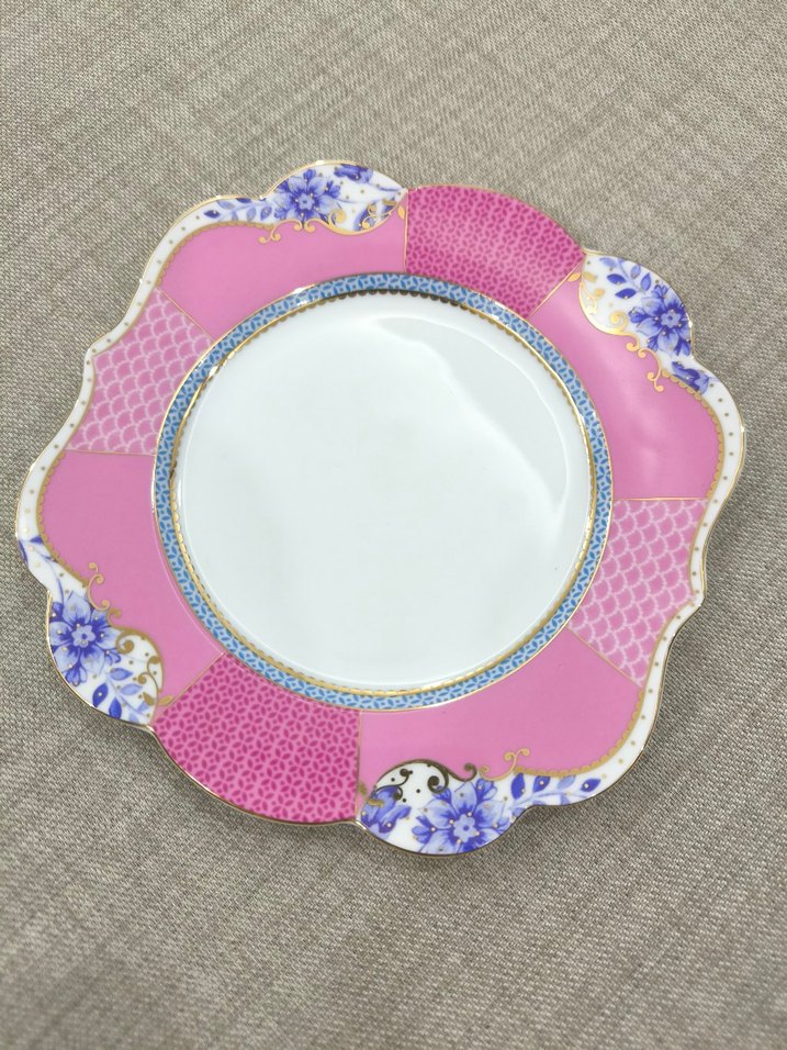 Pastel pembe renkte, çiçek ve altın detaylı, dalgalı kenarlı bir tabak. Şık sunumlar için uygundur. ️