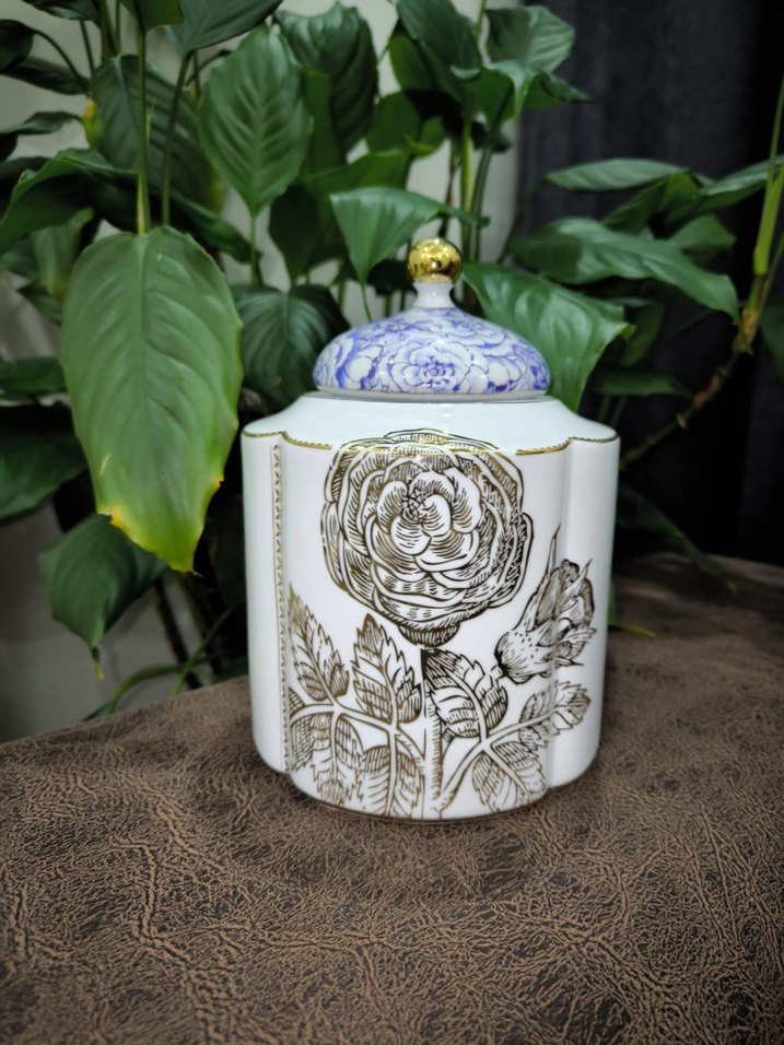 Kapaklı beyaz seramik vazo, üzeri mavi çiçek desenli kapak ve altın renkli çiçek motifleriyle süslenmiştir.