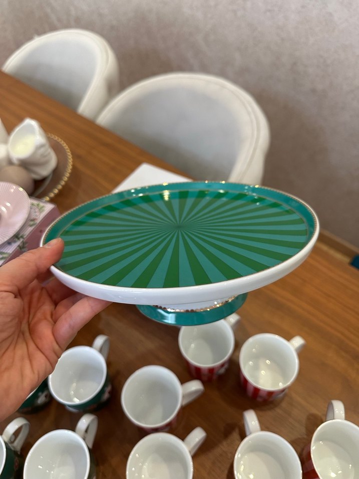 Parlak yeşil renkte, çağdaş desenli ve ayaklı tabak. Sunum veya servis için uygundur. Etiketli ve kutulu %100 orjinal