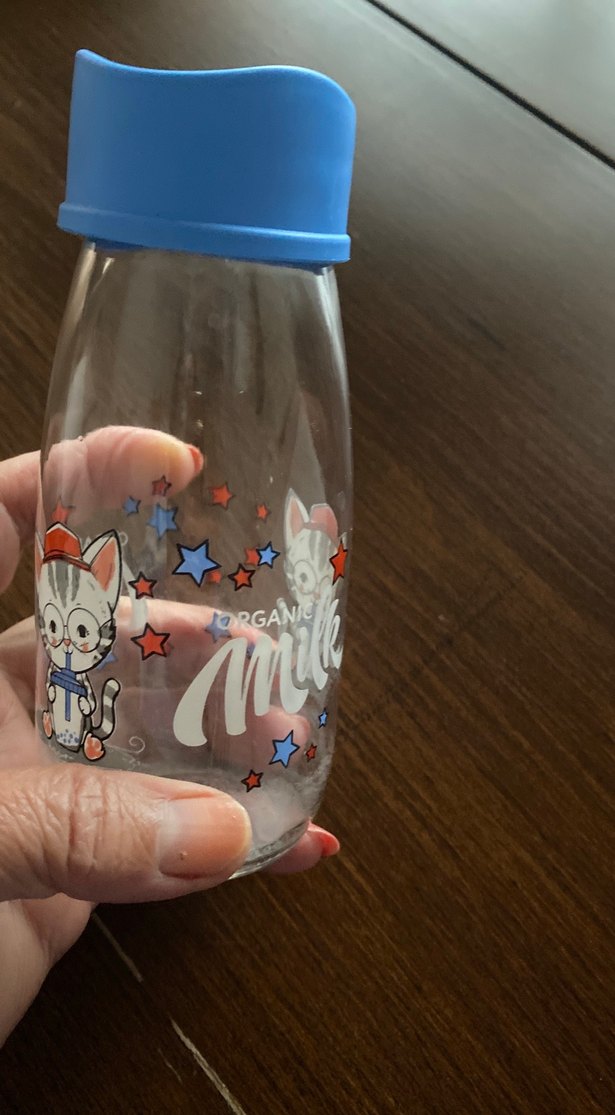 Pastel mavi kapaklı, üzerinde yıldızlar ve kedi figürü bulunan bebek biberonu. Beslenme için uygun ve şık tasarım.