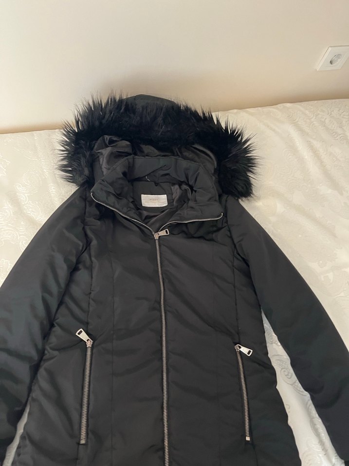 Kürk detaylı kapüşonlu siyah kadın kışlık mont. Yumuşak polar kumaştan, çıtçıtlı yakalı ve fermuarlı ceplerli, dış mekan için uygun. Çok iyi durumda