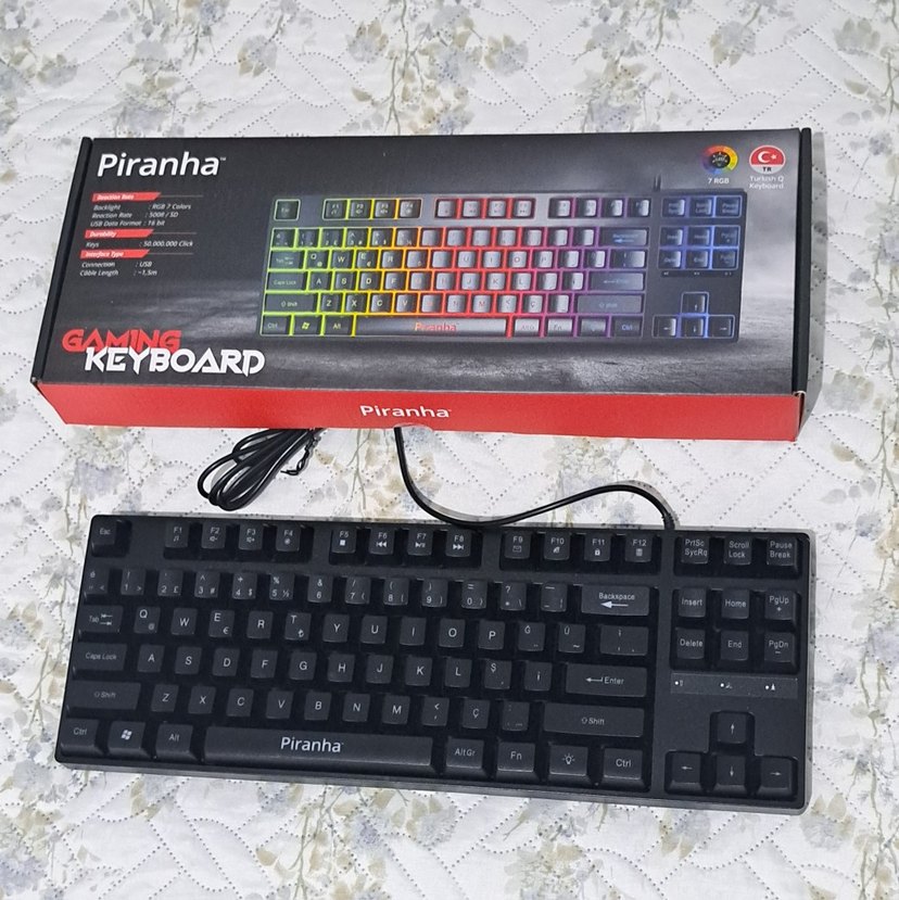 Tuş takımı eksiksizdir, herhangi bir hasarı veya arızası bulunmuyor. 7 renk RGB ışıklandırma bulunduruyor isteğinize göre açıp kapatabilirsiniz. Çok az kullanıldı. Oyun oynamak için ideal bir klavyez kablo uzunluğy 1.5 metredir. Ürünün kutusunun içinde garanti belgesi bulunmaktadır ve 2 yıl garantilidir.