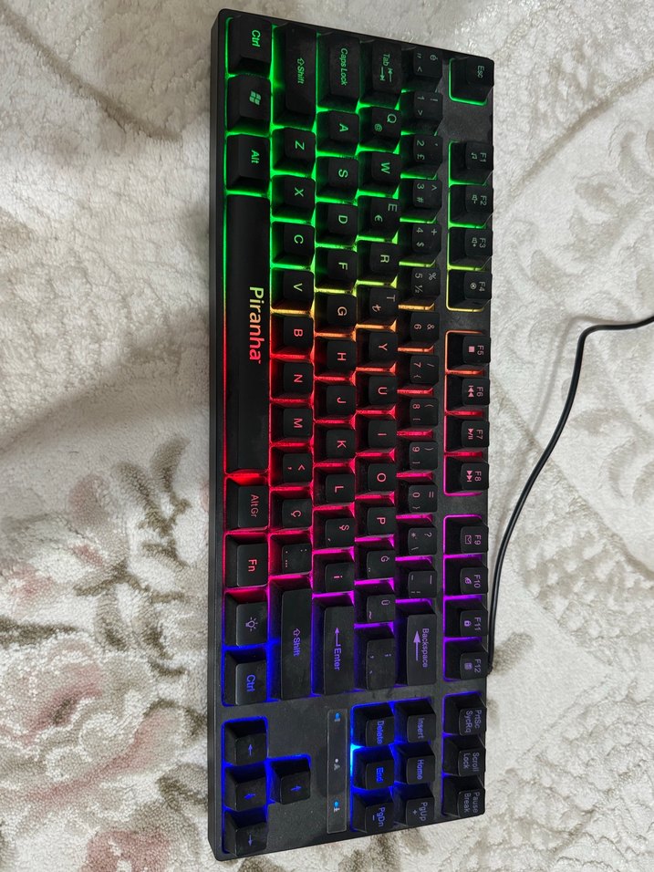 1-2 ay kullandım gaming klavye aldığım için satıyorum yurtdışından. Öne Çıkan Özellikler: - & 7 Farklı RGB Aydınlatma Modu:Oyun atmosterinize renk katın, karanlıkta bile etkileyici görünüm - Bog Tepki Süresi: 500 Hz (500R/SD): Hızlı komutlar, gecikmesiz oyun deneyimi - E Türkçe Q Klavye Düzeni: Türkiye' ye özel, tam konforlu yazım ve oyun deneyimi - 4e Tak-Çalıştır USB Bağlantı: Kurulum gerekmeden anında kullanıma hazır - C 50 Milyon Tuş Basım Ömrü: Uzun ömürlü dayanıklı tuşlar, her oyun seansına hazır Sessiz ve Hassas Tuşlar: Yazı yazarken ya da oyun oynarken sessizlik isteyenler için ideal • 1.5 Metre Kablo Uzunluğu: Rahat hareket alanı sunan esnek kablo tasarımı Multimedya Tuşları: Müzik ve ses kontrolü tek dokunuşla elinizin altında - Uyumluluk: Tüm USB-A girişli Windows, macOS sistemlerle uyumlu Sade tasarımı, renkli ışıkları ve hassasiyet odaklı yapısıyla Piranha 2350, ister oyun oynarken ister günlük kullanımda sizi yarı yolda bırakmaz. • Oyuna ışık katmaya hazır olun.