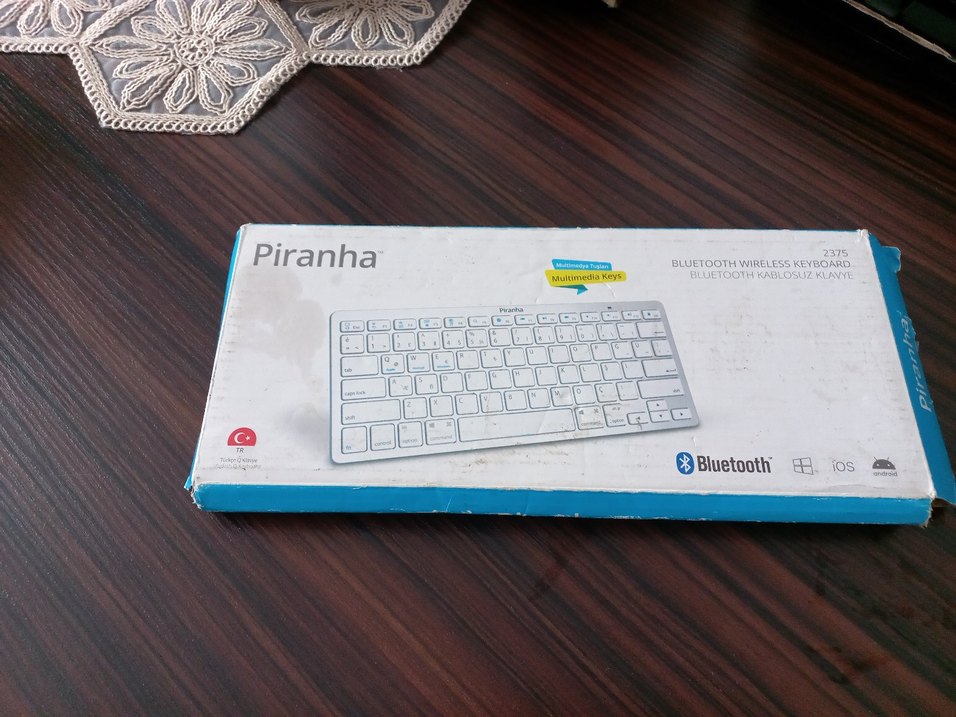 Multimedya tuşlarına sahip beyaz Piranha Bluetooth klavye, kablosuz kullanım için uygundur. Hafif ve şık tasarıma sahiptir. ⌨️ Tek tuş yoktur ama basilabiliyor