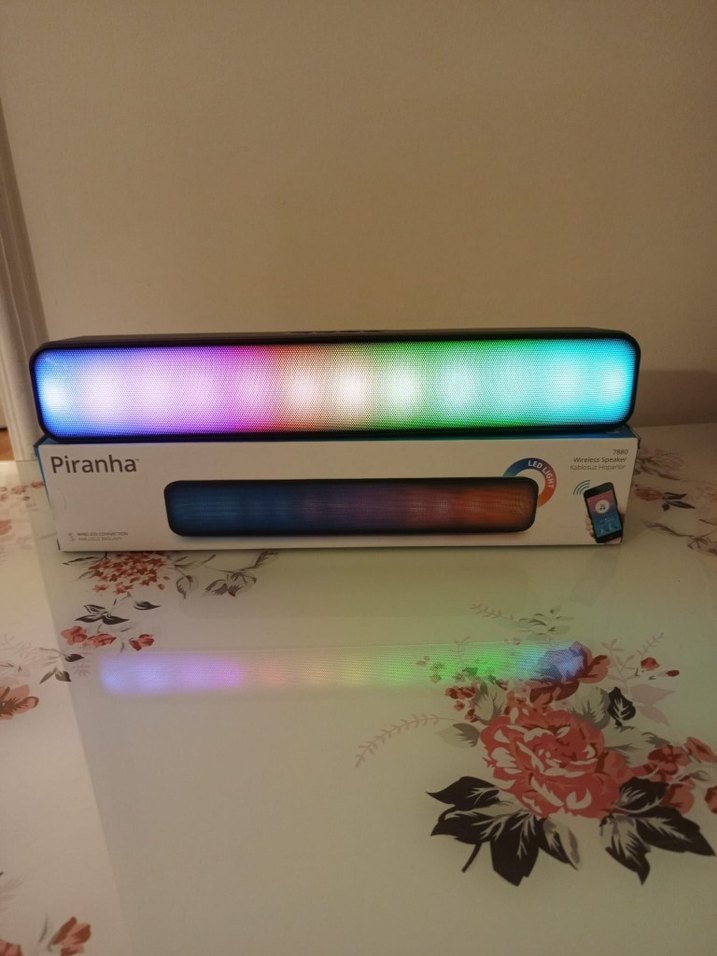 Piranha Bluetooth hoparlör, çok renkli ışıklı uzun tasarımıyla sesi renklendirir ve etkileyici bir deneyim sunar. sıfır ürün.