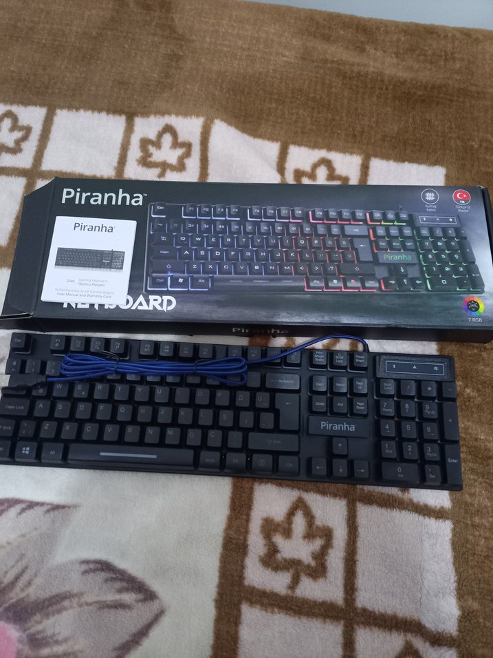 Piranha kablolu klavye, çok renkli ışıklandırmaya ve tam tuş düzenine sahiptir. Mavi USB kablo bağlantısı bulunur.