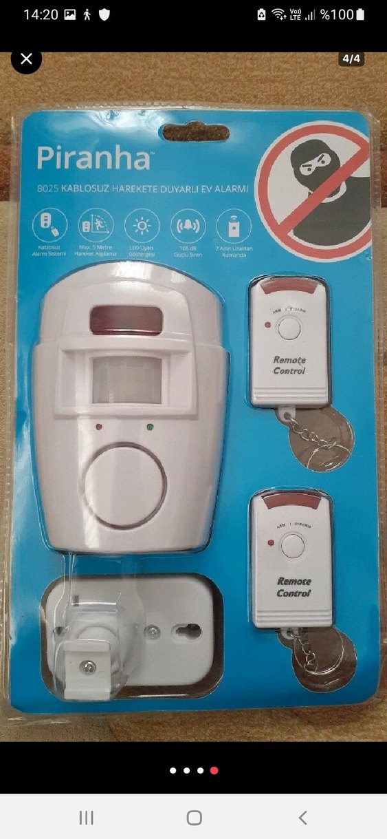 Piranha kablosuz hareket sensörlü ev alarmı, uzaktan kumanda, LED göstergeler ve 5 metre algılama mesafesine sahiptir. 105 dB ses çıkarır, 2 hassasiyet ayarı bulunur.
